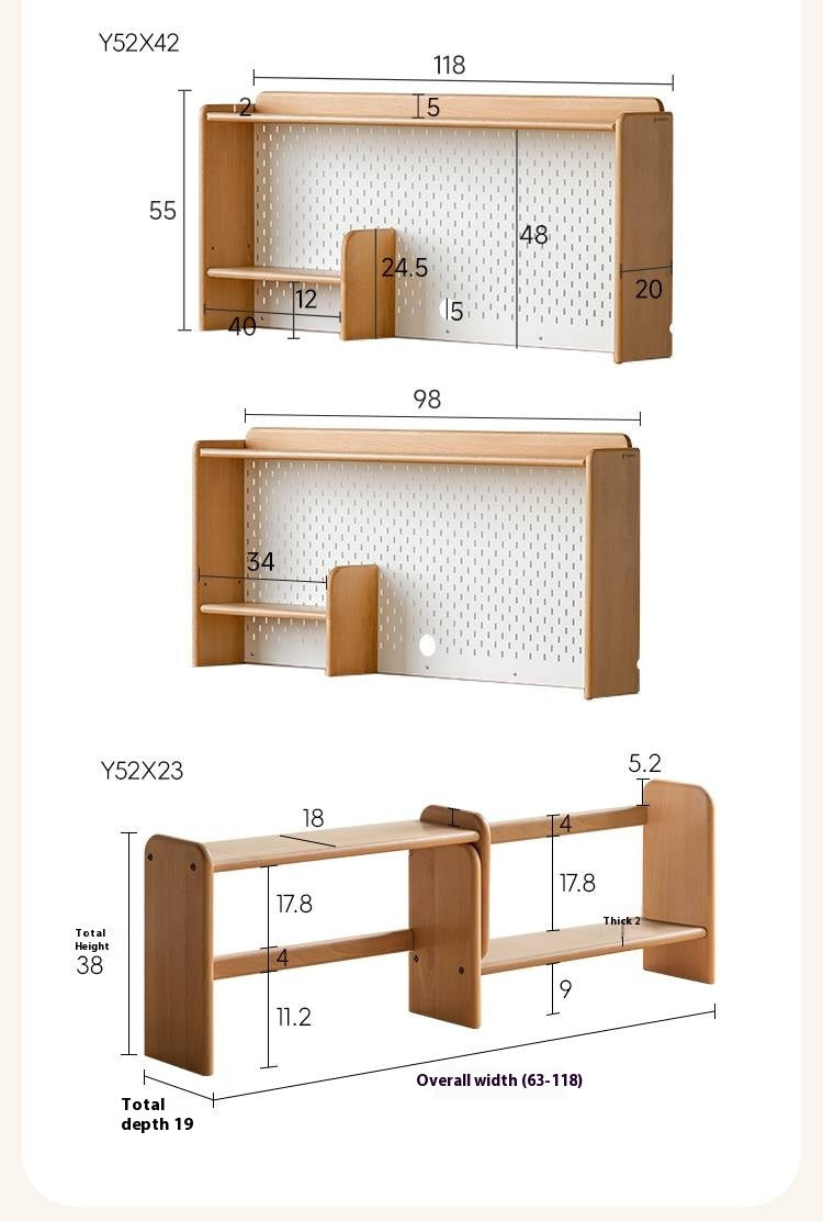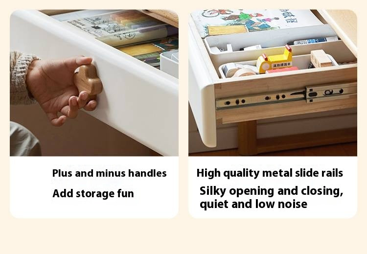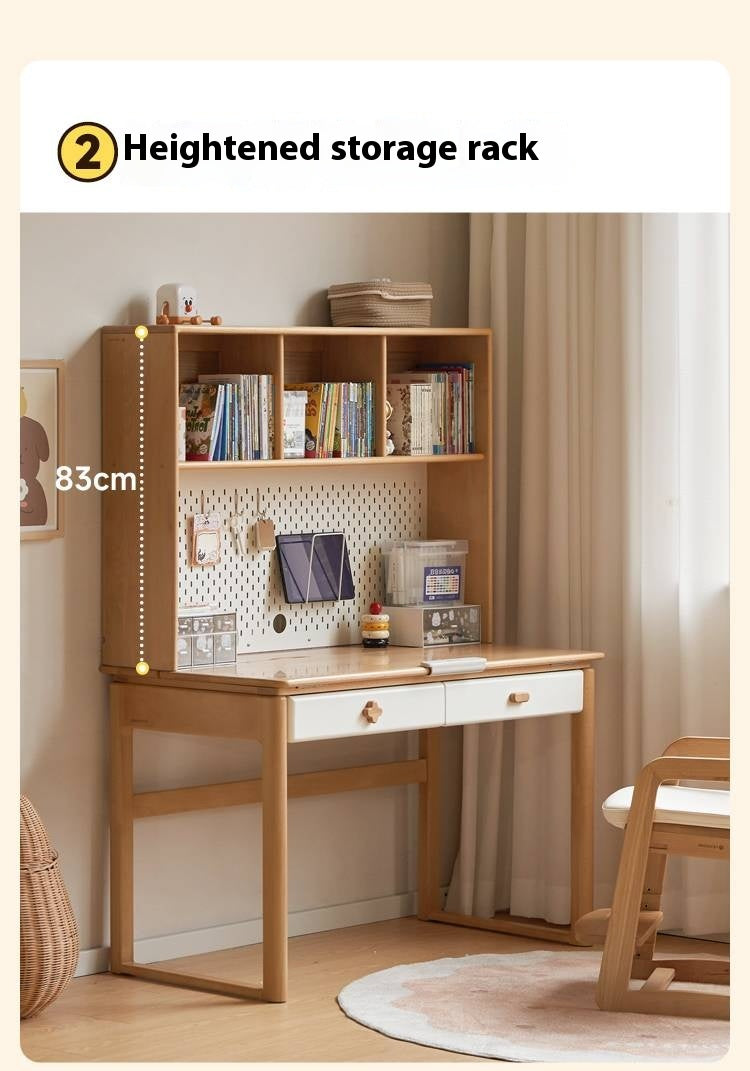 This kids' learning desk is made from 100% solid European beech wood, known for its fine grain, warm color, and durability. It includes New Zealand pine for the frame and leg pads, offering strength and stability. Paulownia wood is used for certain parts, providing resistance to wear and deformation. The white desktop surface is smooth and sturdy, designed for lasting use. A stainless steel three-section slide rail ensures smooth drawer movement. The desk also features an eye protection lamp to support comfortable and healthy study sessions.