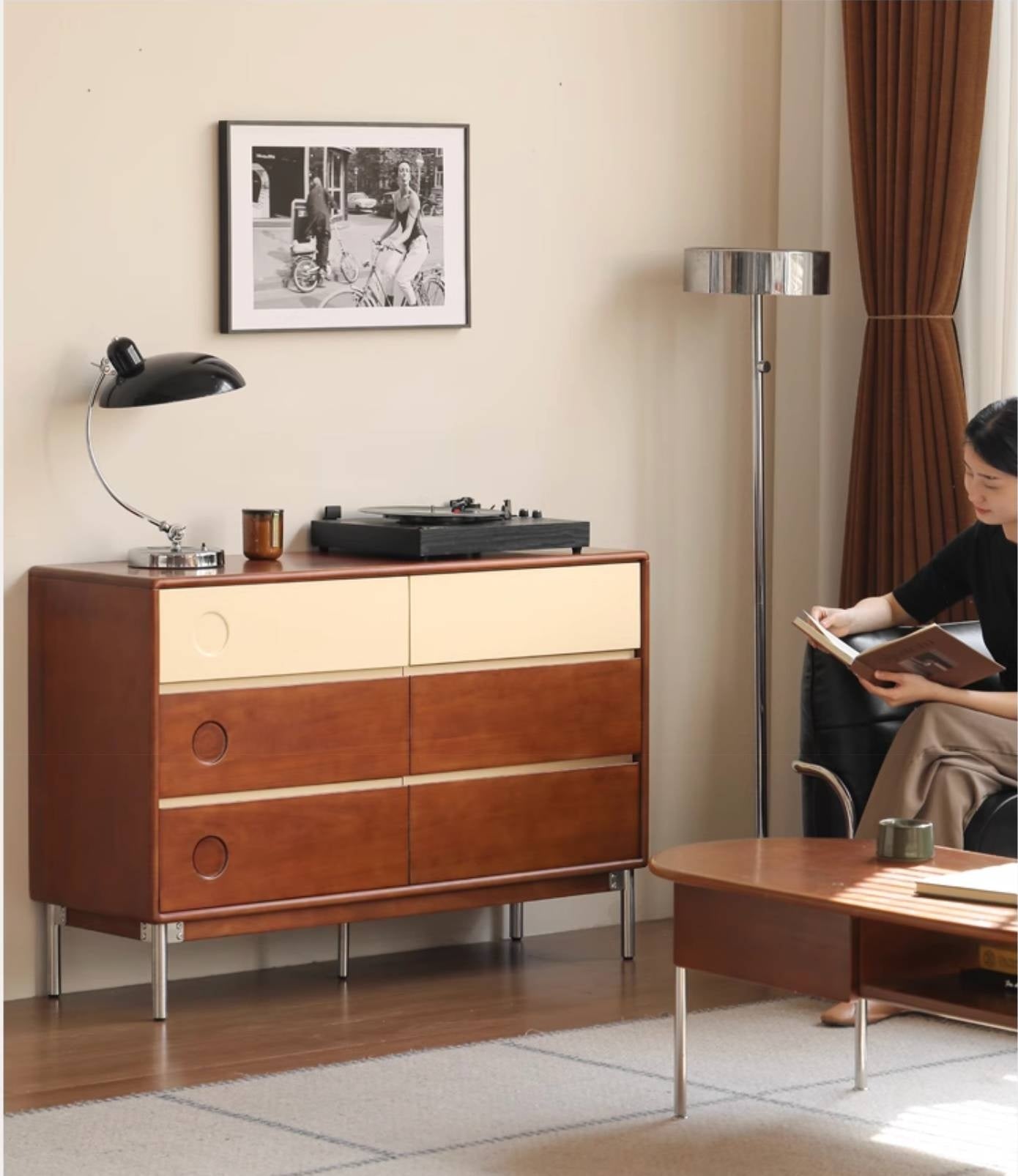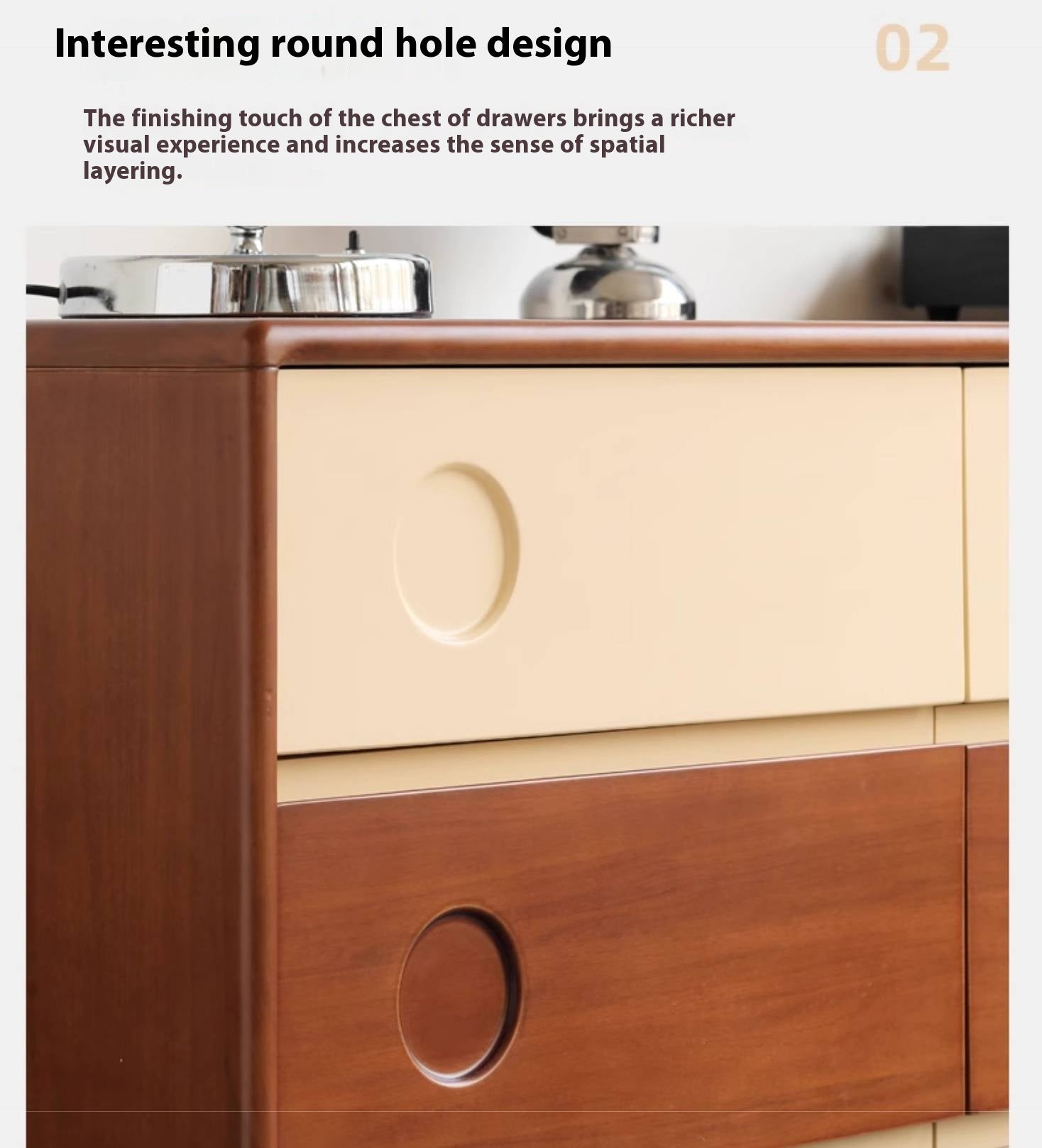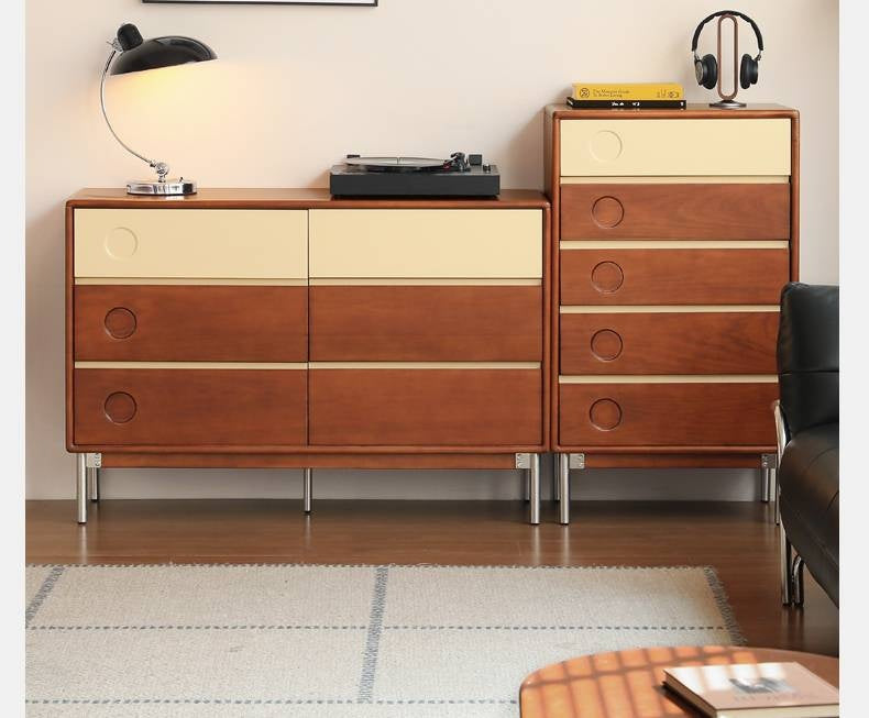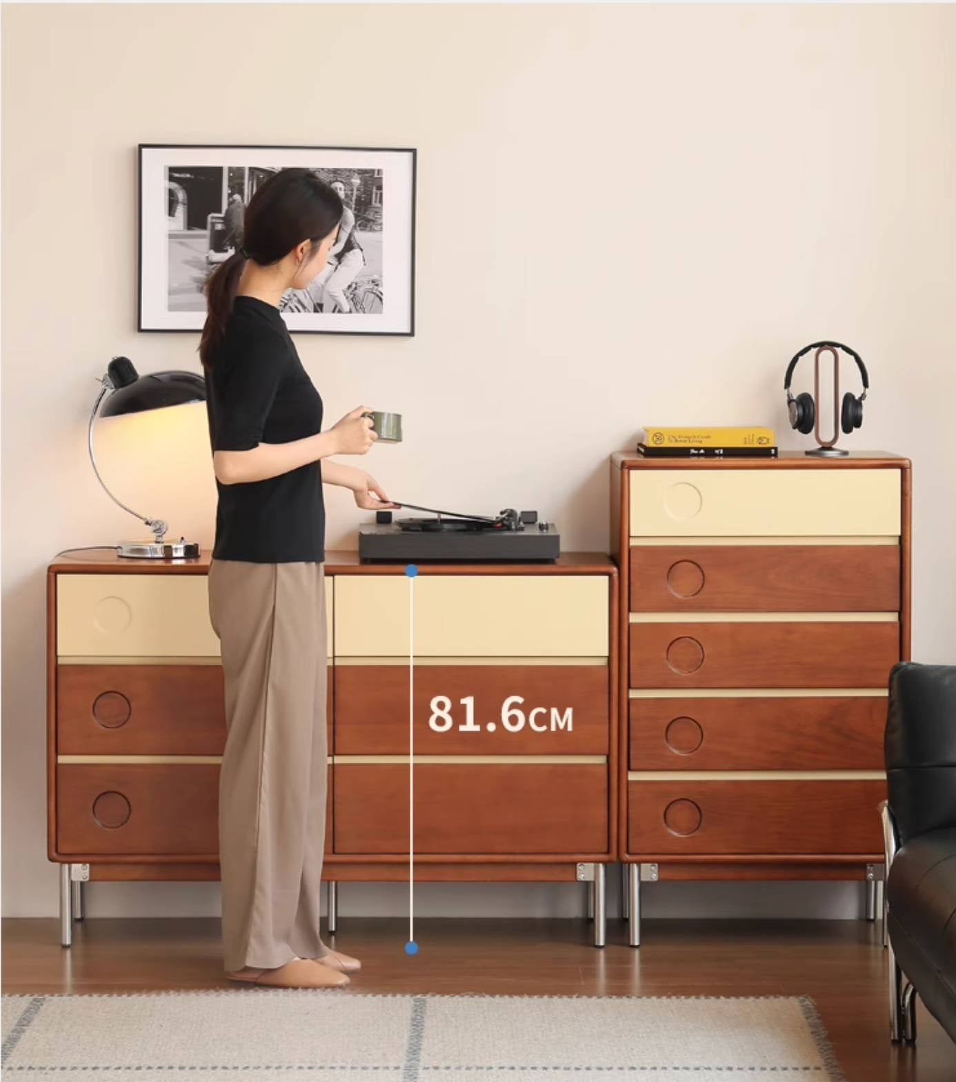 Tribute to Danish classic design. Reproduce the aesthetics of low-saturation colors. The clever collision of teak color and milk apricot. Garden hole design adds fun. Create an artistic storage that combines function and aesthetics. Reinterpreting the Medieval Bauhaus.