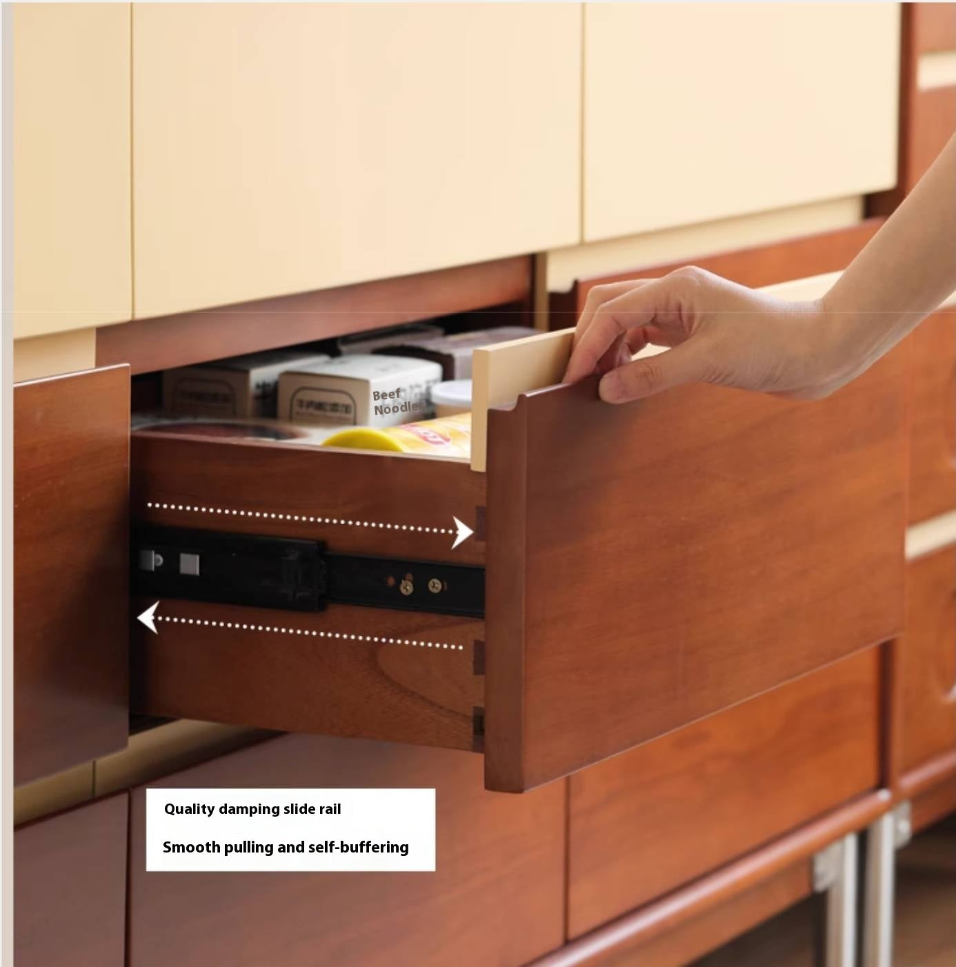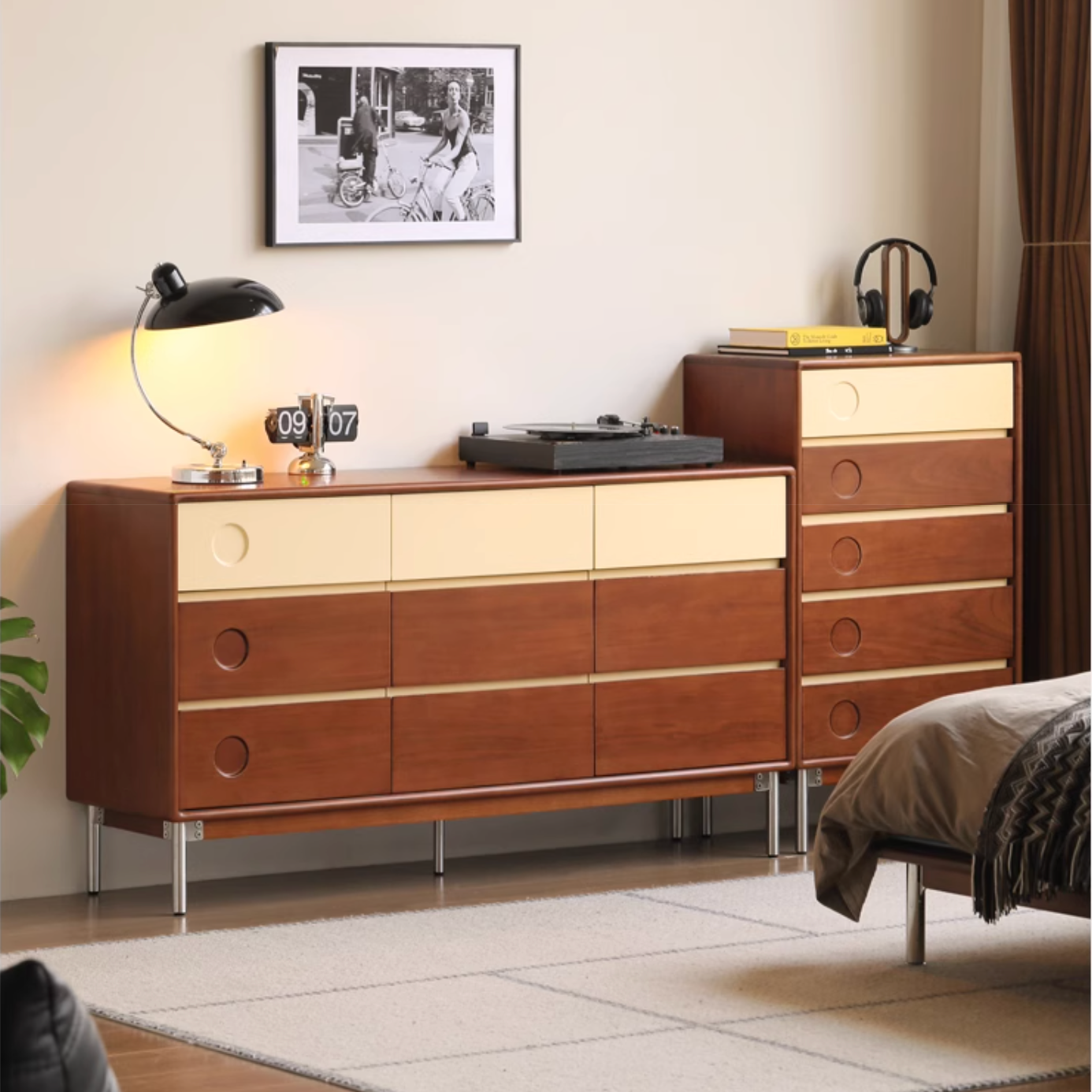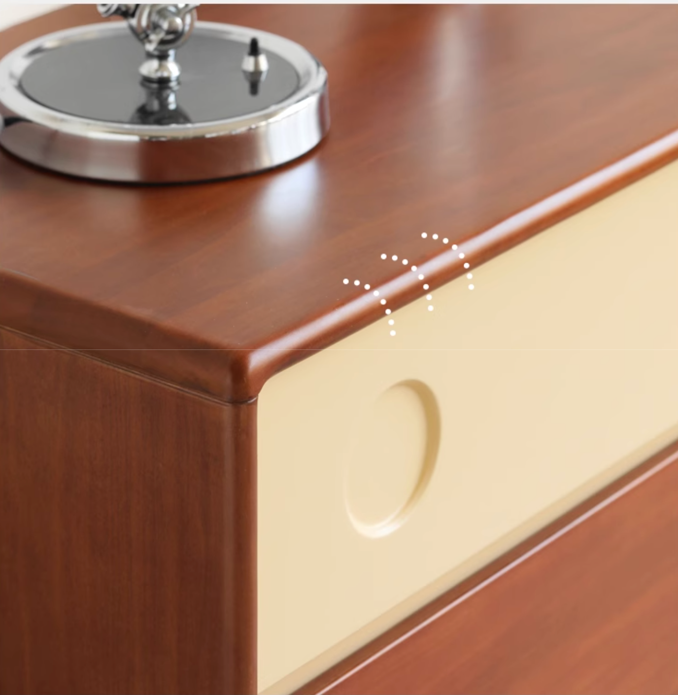 Tribute to Danish classic design. Reproduce the aesthetics of low-saturation colors. The clever collision of teak color and milk apricot. Garden hole design adds fun. Create an artistic storage that combines function and aesthetics. Reinterpreting the Medieval Bauhaus.
