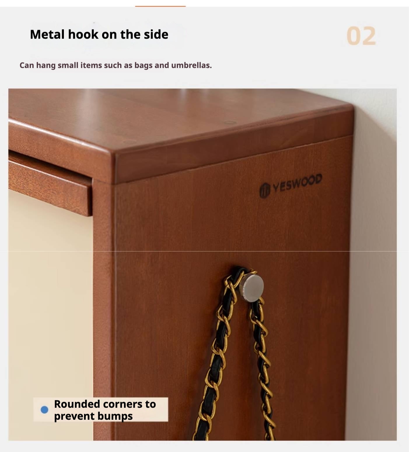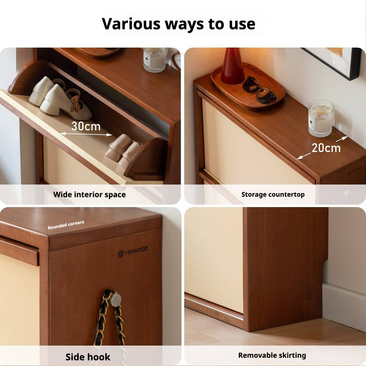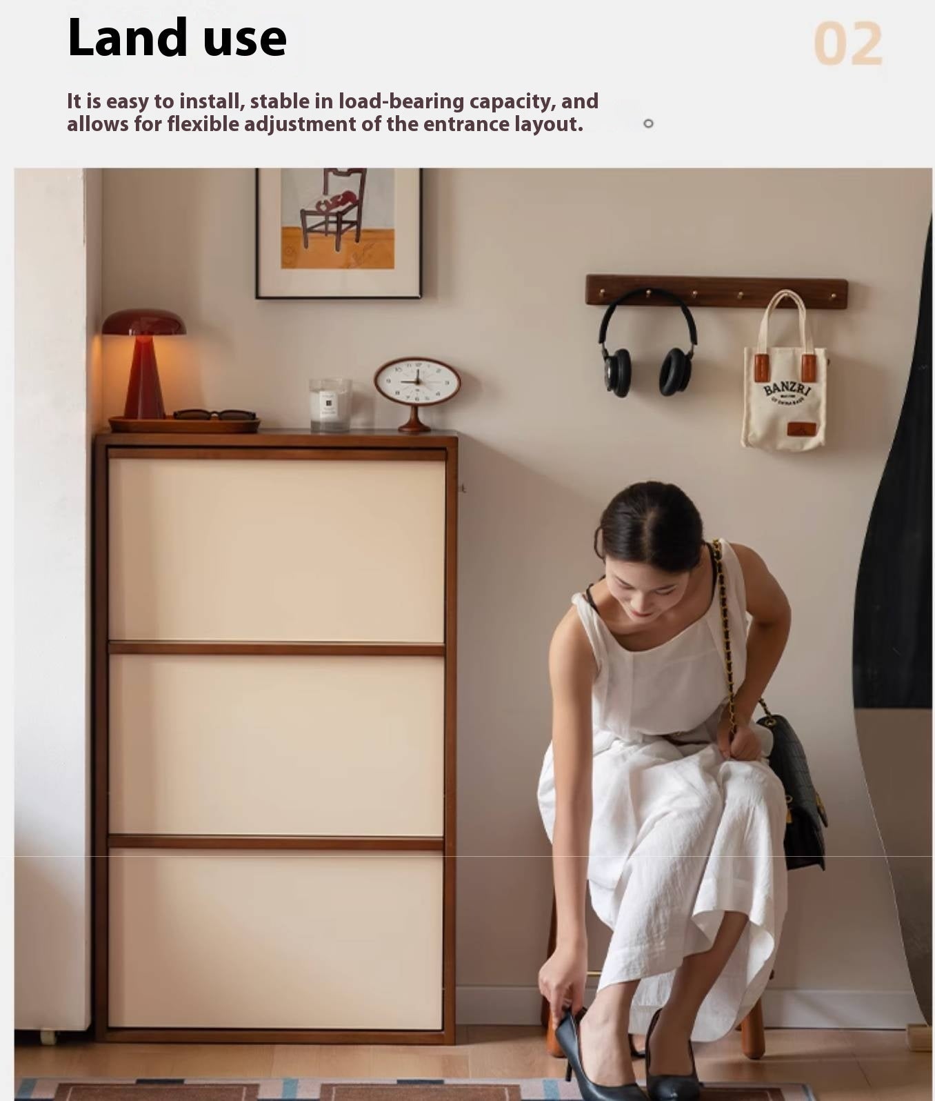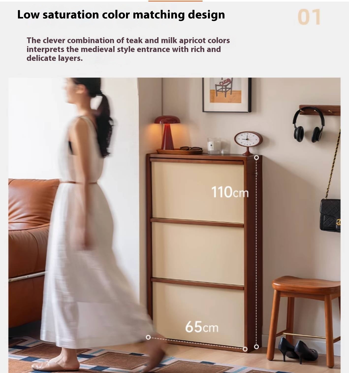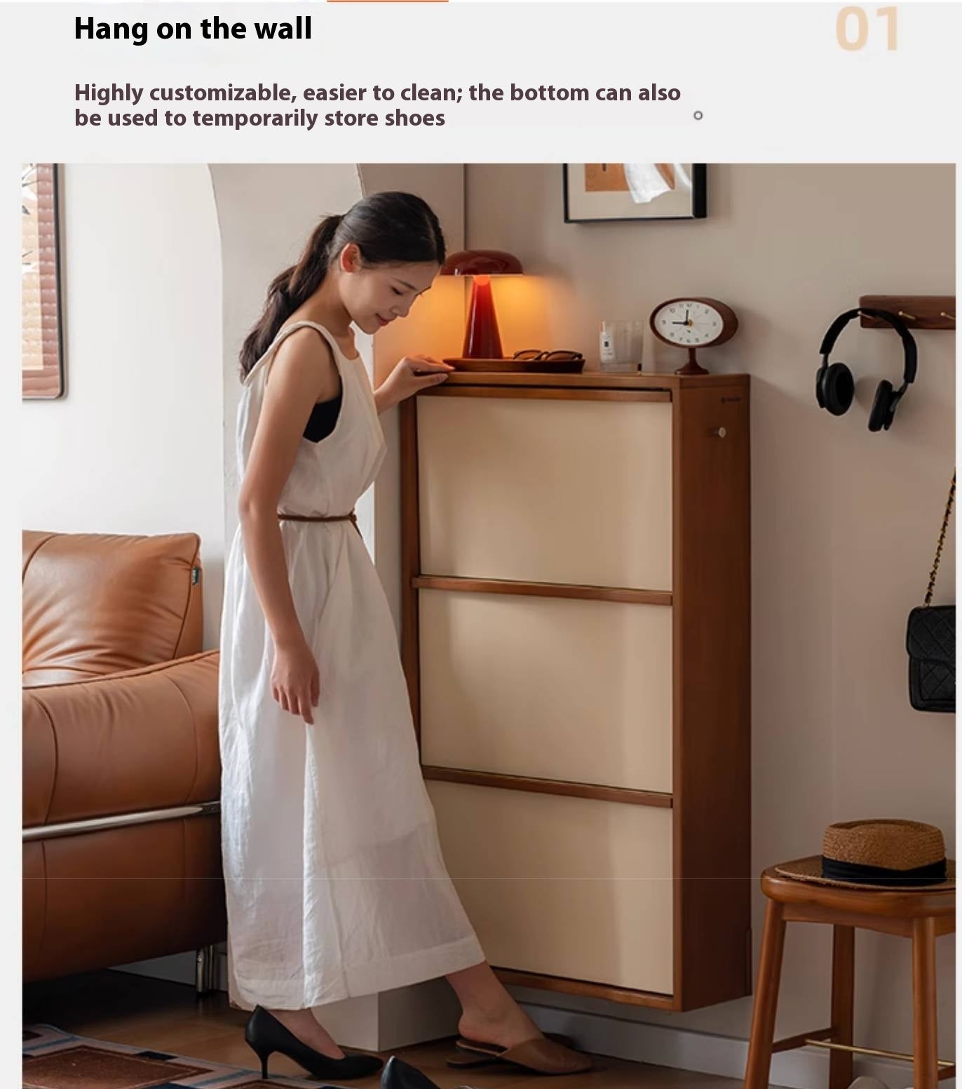 This poplar solid wood shoe cabinet features a subtle creme brulee contrast inspired by Danish design. Its ultra-thin profile allows wall mounting, saving space while offering versatile storage. Perfect for adding a medieval touch to your porch with practical, compact organization.