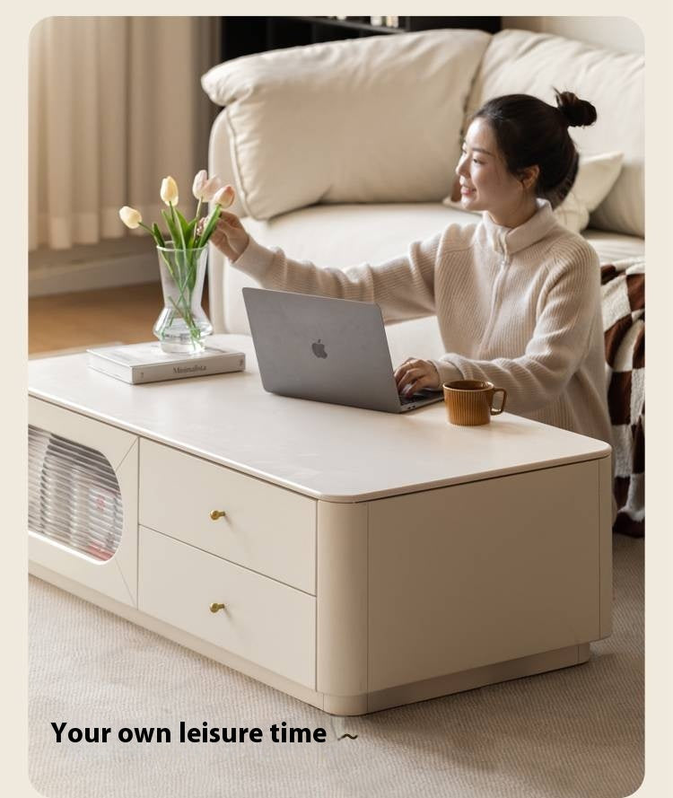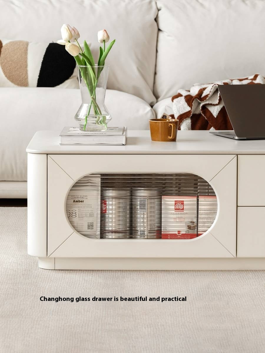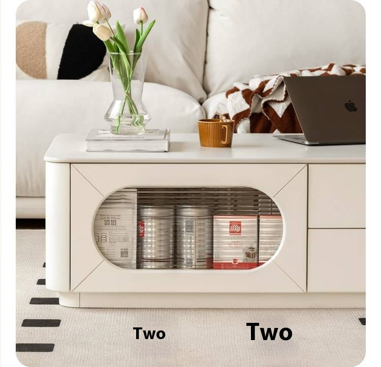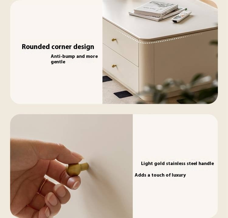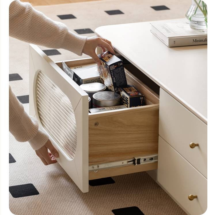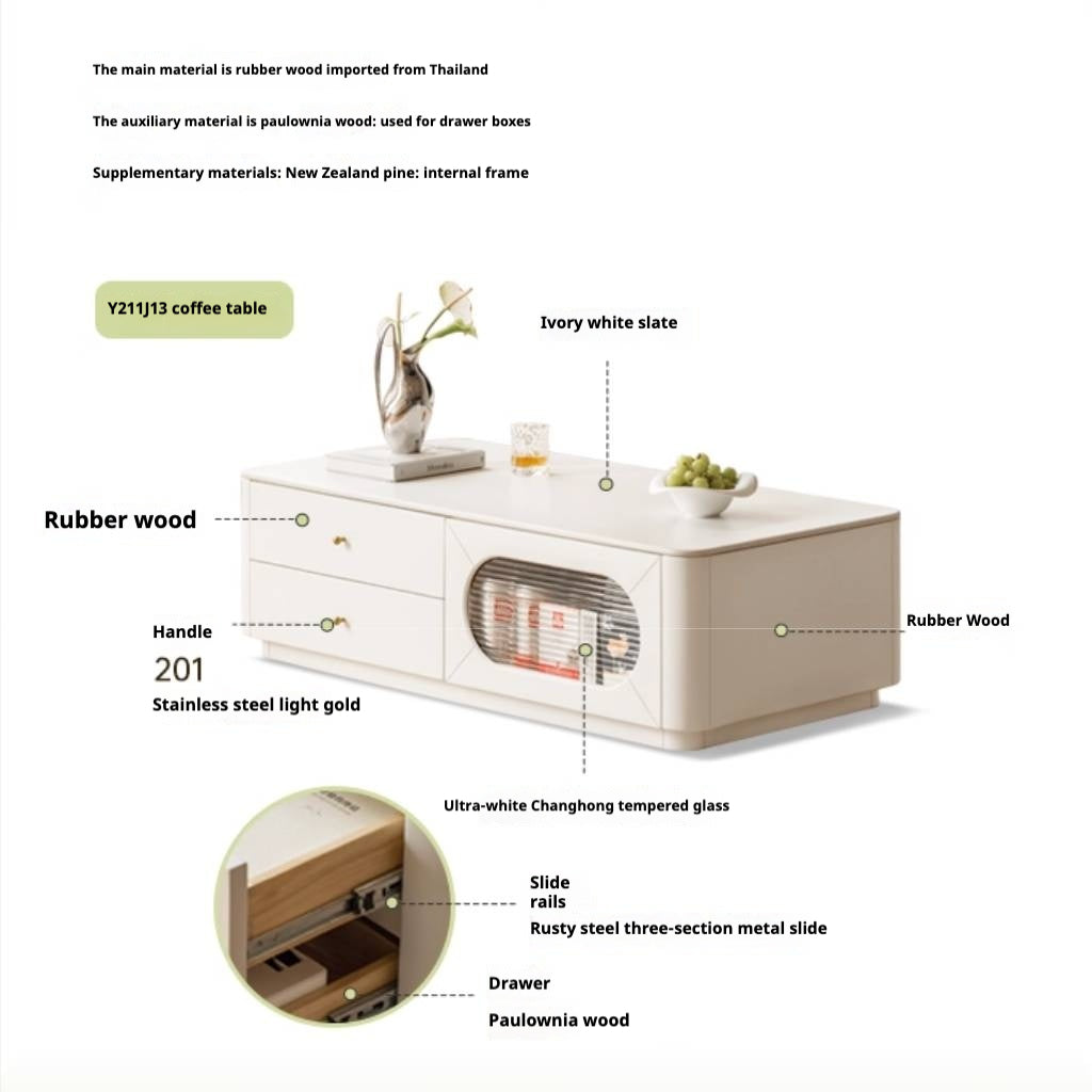 This coffee table features a durable rubberwood frame imported from Thailand, crafted with finger jointing to prevent deformation and cracking. It includes corrosion-resistant Paulownia wood for structural parts and lightweight New Zealand pine for the internal frame. The handle is made of 201 stainless steel with a light gold finish, complemented by a 5mm ultra-white tempered glass door panel. Smooth operation is ensured by stainless steel three-section slide rails, and the tabletop showcases an elegant ivory white rock slab.