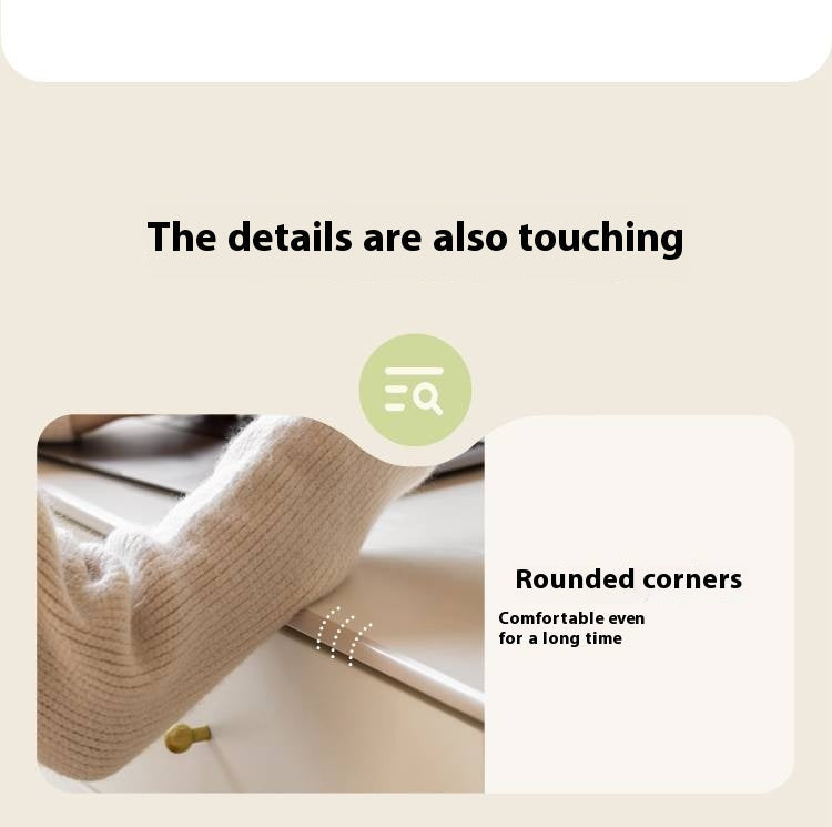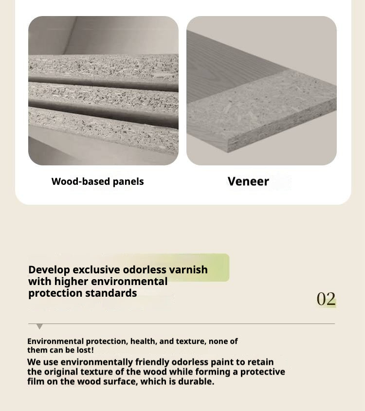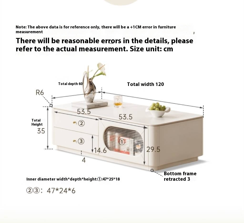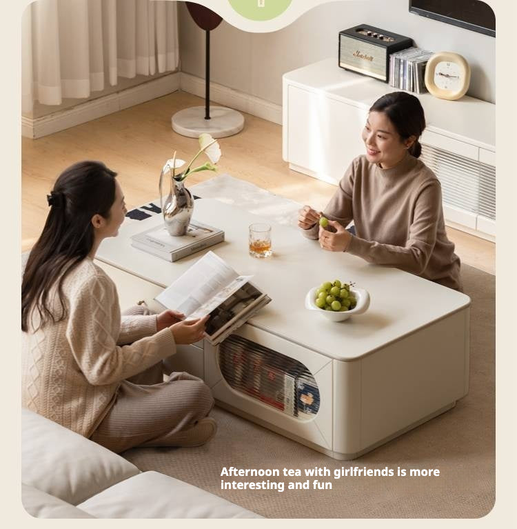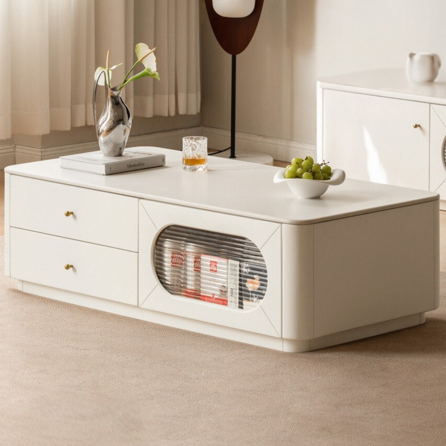 This coffee table features a durable rubberwood frame imported from Thailand, crafted with finger jointing to prevent deformation and cracking. It includes corrosion-resistant Paulownia wood for structural parts and lightweight New Zealand pine for the internal frame. The handle is made of 201 stainless steel with a light gold finish, complemented by a 5mm ultra-white tempered glass door panel. Smooth operation is ensured by stainless steel three-section slide rails, and the tabletop showcases an elegant ivory white rock slab.