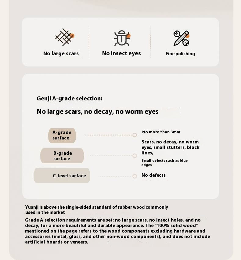 1. The "100% solid wood" mentioned on this page refers to the wooden parts other than hardware and accessories (metal, glass and other non-wood parts), and does not include artificial boards or veneers.