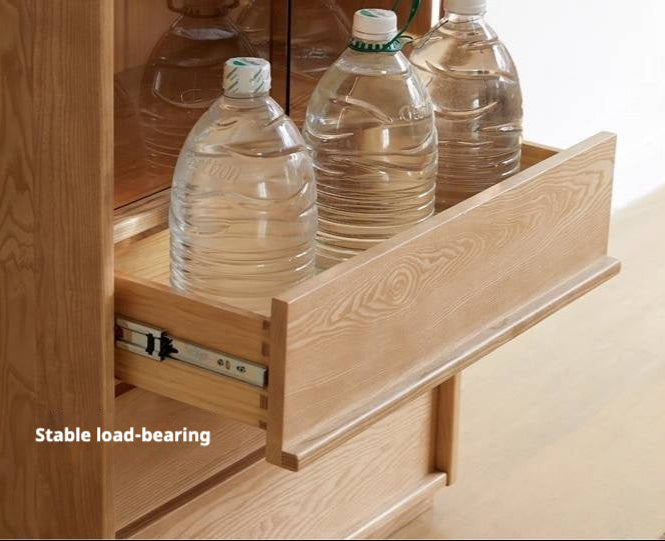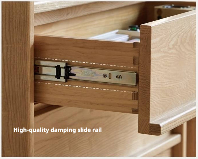 1.The xylem is divided into 100% pure solid wood (refers to all wood except hardware and accessories). Part), does not contain wood-based panels, does not stick to the skin, the product may contain metal, glass, etc. Non-wooden accessories. 2.The main material is imported high-grade ash, high-grade hardwood imported from Europe, The representative wood of log wind, it has a hard texture, wear-resistant and corrosion-resistant.Obvious wood grain texture, It is a beautiful mountain shape or water wave shape. 3.The auxiliary material is pine wood, which is used for pumping boxes and backboards; it has good toughness, stable properties and high texture. It is light, the texture is straight and the use is less. 4.The flexion slide rail is a three-section steel ball metal damping slide rail with buffer. 5.The sliding door glass is flat gray glass (thickness 5mm)