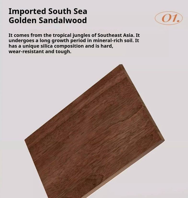2. The main material is Nanyang golden sandalwood, scientifically known as Sven lacquer wood. The material is imported from Southeast Asia. The texture is straight and has few scars. It is hard, wear-resistant and not easy to crack. It can adapt to dry or humid environments.