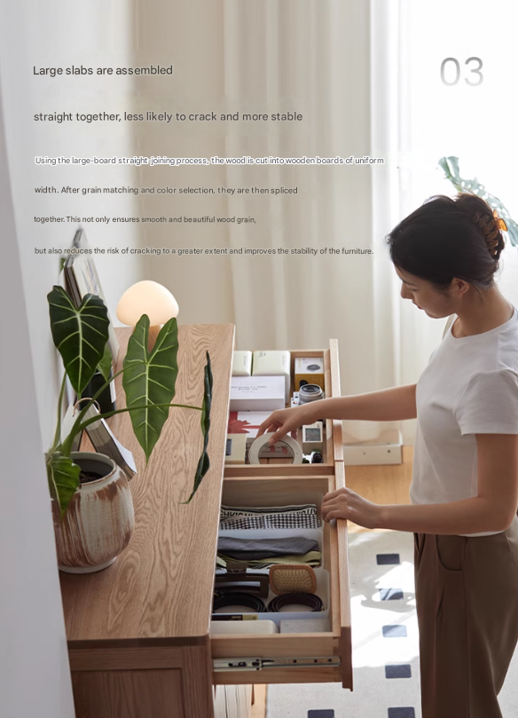 4. Auxiliary material ② is paulownia wood used for the baseboard core board, backboard, partition, and drawer box; it is corrosion-resistant, wear-resistant, high-temperature resistant, non-deformable, and not prone to mold.