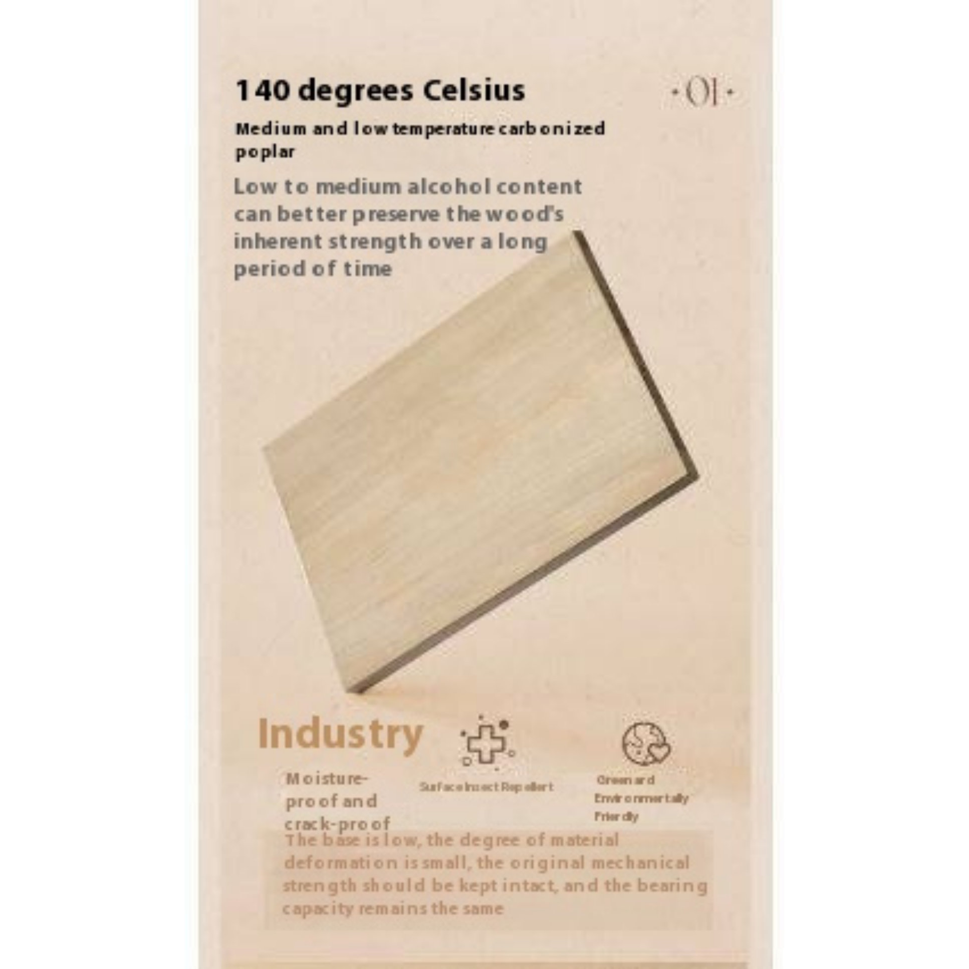 2. The main material is poplar, which has been carbonized at medium and low temperatures for a long time, which can better retain the original performance strength of the wood, greatly reduce the chance of cracking, improve stability, and at the same time increase antibacterial, insect-proof and anti-corrosion properties for durability.